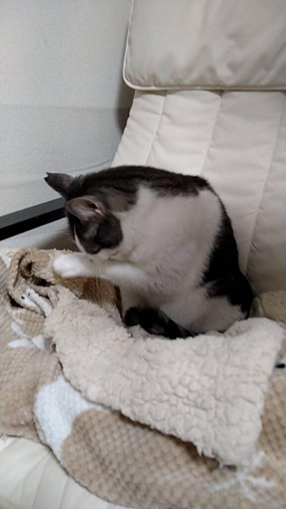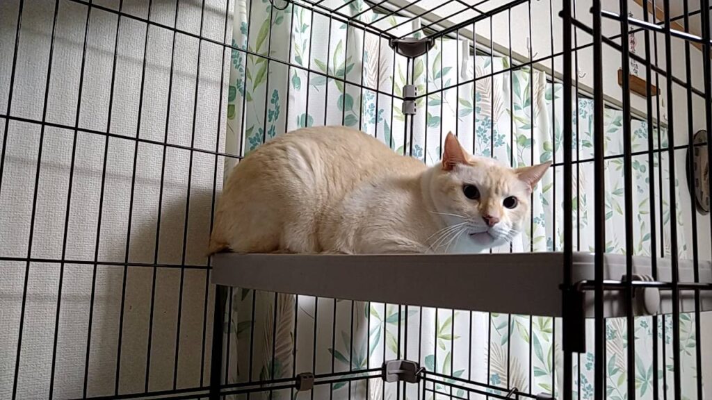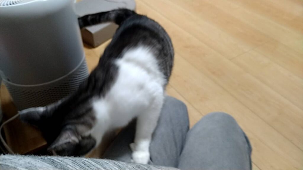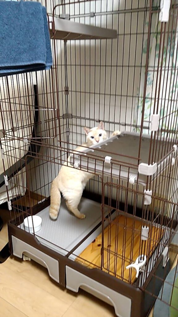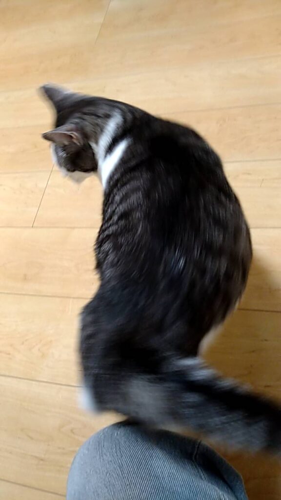 猫部屋のドアを開けたタイミングが悪かった様で、きなこ君は二本足で立ったまま約1分強は掴まり立ちをしていました(ごめんね)